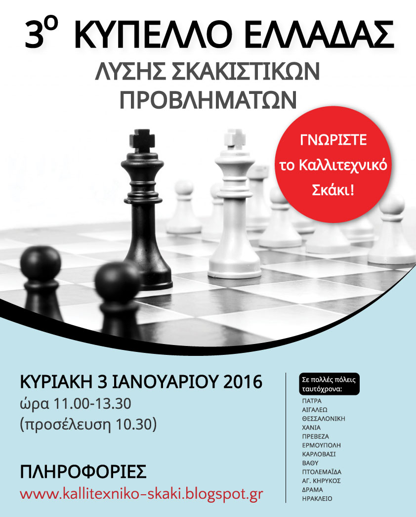 Με την ευκαιρία της διοργάνωσης του 3ου κυπέλλου Ελλάδας λύσης σκακιστικών προβλημάτων, που θα γίνει το πρωί της Κυριακής 3/1/2016 ταυτόχρονα σε διάφορες πόλεις της Ελλάδας, ο Σ. Ο. Χαλανδρίου διοργανώνει μια διάλεξη με θέμα: «Γνωρίστε το καλλιτεχνικό σκάκι». Η διάλεξη θα λάβει χώρα την Κυριακή 27/12/2015 και ώρα 18:00 στο εντευκτήριο του Ομίλου μας, Αβέρωφ 4, Χαλάνδρι. Εισηγητής θα είναι, ευγενώς προσφερθείς, ο κύριος Νίκος Μενδρινός, εθνικός μαιτρ και τρεις φορές πρωταθλητής Ελλάδος στο καλλιτεχνικό σκάκι. Περισσότερες πληροφορίες γι’ αυτήν τη διαφορετική σκακιστική ενασχόληση θα βρείτε εδώ.