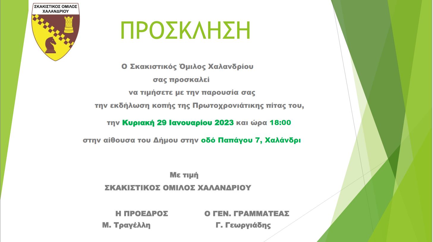 Κοπή πίτας Προβολή μεγαλύτερης εικόνας ΠΑΥΛΟΣ ΔΕΥΤΕΡ2023-01-19T00:28:11+02:0019 Ιανουαρίου, 2023|Uncategorized, Ανακοινώσεις| Μοιράσου το! FacebookTwitterLinkedInPinterestEmail Σχετικά Άρθρα ΠΡΩΤΑΘΛΗΤΕΣ ΕΛΛΑΔΟΣ ΠΑΙΔΩΝ ΚΟΡΑΣΙΔΩΝ 2025 🏆 ΠΡΩΤΑΘΛΗΤΕΣ ΕΛΛΑΔΟΣ ΠΑΙΔΩΝ ΚΟΡΑΣΙΔΩΝ 2025 🏆 8 Δεκεμβρίου, 2025 ΠΡΩΤΑΘΛΗΤΕΣ ΣΤΟ ΠΑΙΔΩΝ ΚΟΡΑΣΙΔΩΝ ΑΤΤΙΚΗΣ!!! ΠΡΩΤΑΘΛΗΤΕΣ ΣΤΟ ΠΑΙΔΩΝ ΚΟΡΑΣΙΔΩΝ ΑΤΤΙΚΗΣ!!! 18 Νοεμβρίου, 2025 5ο Open Τουρνουά από τον ΣΟ Χαλανδρίου 5ο Open Τουρνουά από τον ΣΟ Χαλανδρίου 15 Σεπτεμβρίου, 2025 15th Open Grand Prix Σ.Ο.Χαλανδρίου 15th Open Grand Prix Σ.Ο.Χαλανδρίου 14 Αυγούστου, 2025 ΠΑΝΕΛΛΗΝΙΑ ΑΤΟΜΙΚΑ ΝΕΑΝΙΚΑ ΠΡΩΤΑΘΛΗΜΑΤΑ ΠΑΙΔΩΝ ΚΟΡΑΣΙΔΩΝ 2025 ΠΑΝΕΛΛΗΝΙΑ ΑΤΟΜΙΚΑ ΝΕΑΝΙΚΑ ΠΡΩΤΑΘΛΗΜΑΤΑ ΠΑΙΔΩΝ ΚΟΡΑΣΙΔΩΝ 2025 17 Ιουλίου, 2025 Ξανά στην Α’ Εθνική! Ξανά στην Α’ Εθνική! 12 Ιουλίου, 2025 ΣΚΑΚΙΣΤΙΚΟ ΦΕΣΤΙΒΑΛ ΧΑΛΑΝΔΡΙΟΥ 2025♟ ΣΚΑΚΙΣΤΙΚΟ ΦΕΣΤΙΒΑΛ ΧΑΛΑΝΔΡΙΟΥ 2025♟ 11 Ιουνίου, 2025 Σκακιστικό Φεστιβάλ Χαλανδρίου Σκακιστικό Φεστιβάλ Χαλανδρίου 14 Μαΐου, 2025